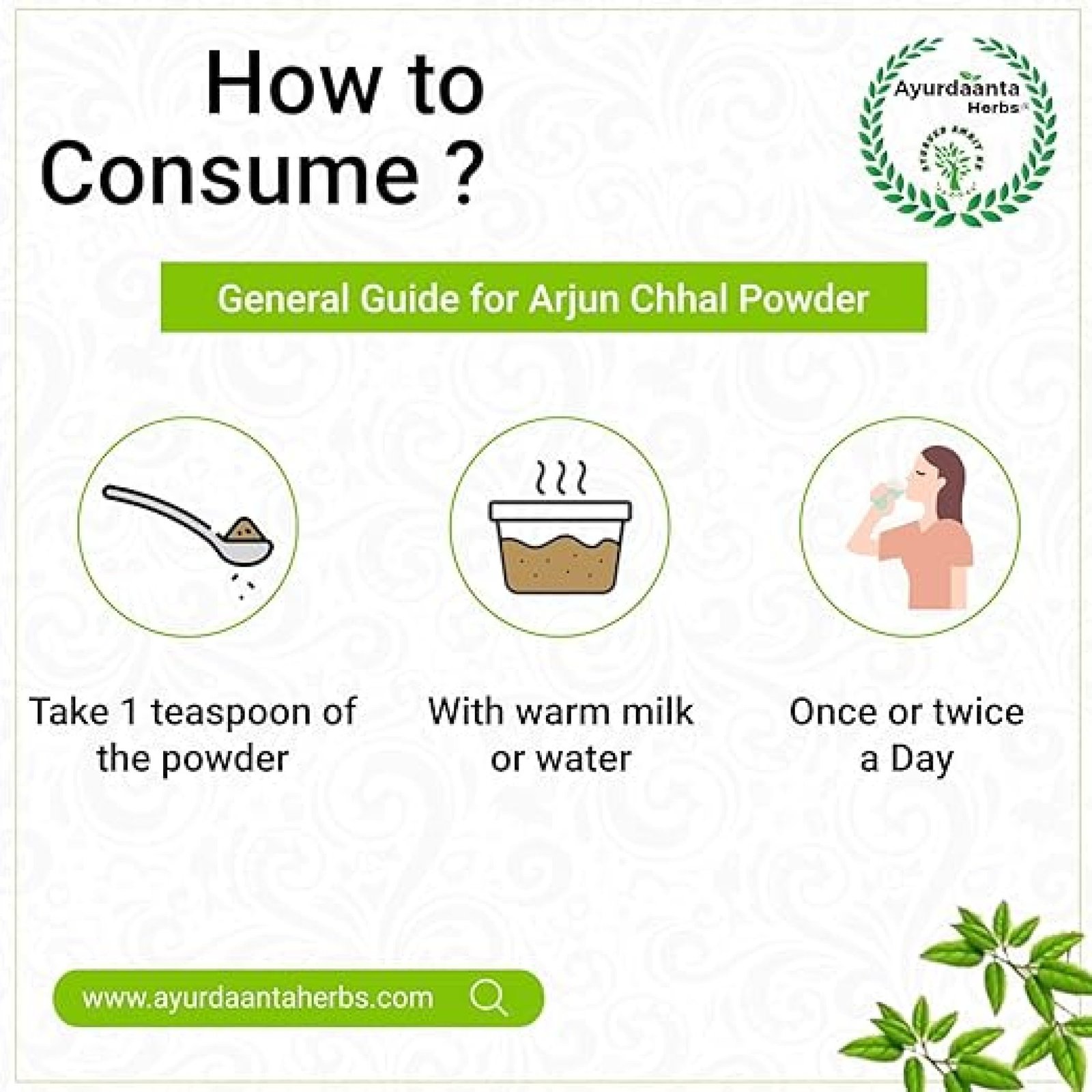 Mix 1 teaspoon (3–5g) of Arjun Chal Powder with warm water, milk, or honey, or as directed by a physician.