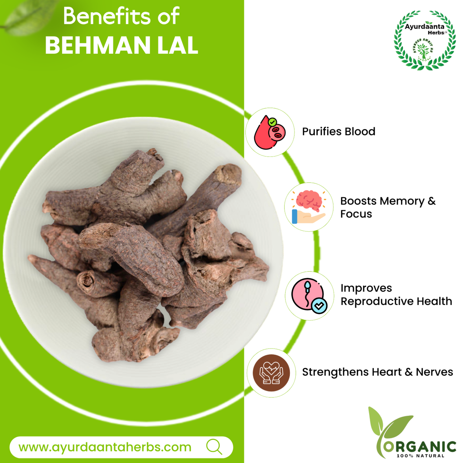 आयुर्वेद के अनुसार बहमन लाल मधुर रस और शीत वीर्य वाला एक श्रेष्ठ रसायन (टॉनिक) है। यह वाता-पित्त दोष को शांत करता है, मज्जा और शुक्र धातु को पोषण देता है और दीर्घायु, ऊर्जा व संतुलन को बढ़ावा देता है।